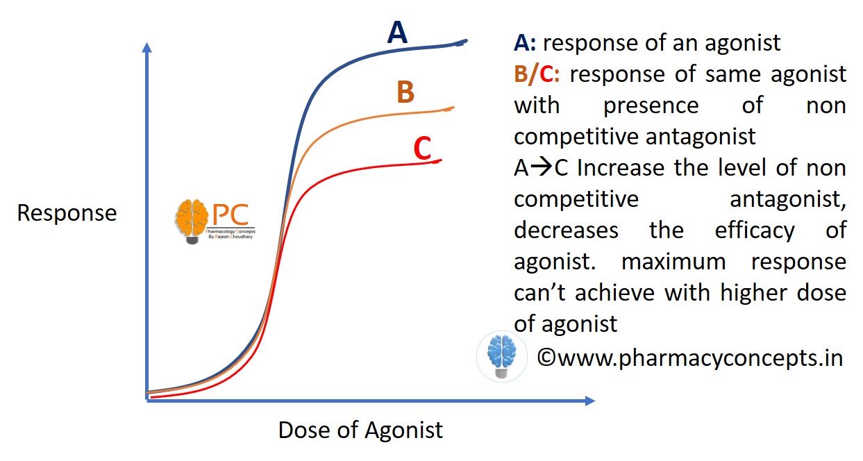 C) Non-Competitive Antagonism: An antagonist acts on the allosteric site of the same receptor (only binds) of agonist or irreversible bind with the same site of the same receptor, prevent the binding and or producing an effect by an agonist. Irreversible binding can’t be overcome by a high dose of agonist.