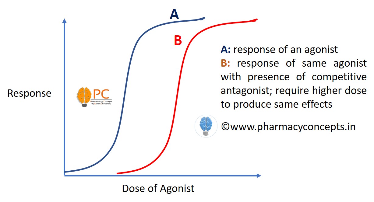 B) Competitive Antagonism (most common in clinical practice): An antagonist acts on the same site of the same receptor (only binds) of the agonist, preventing the binding and producing an effect by an agonist. Antagonist binding is reversible and can be overcome by a high dose of agonist.