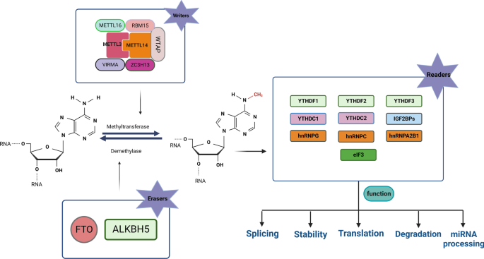 Erasers remove the m6A mark when the regulation is no longer needed.